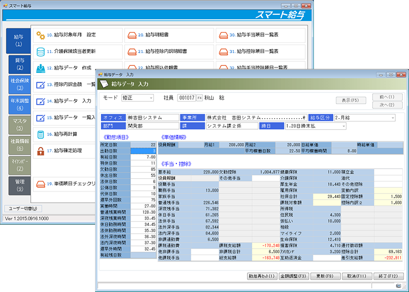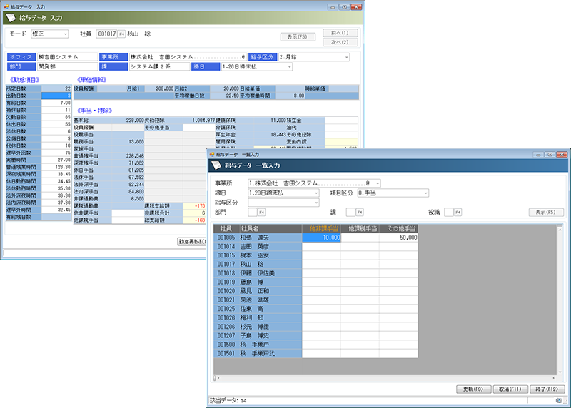給与処理の主な入力画面。