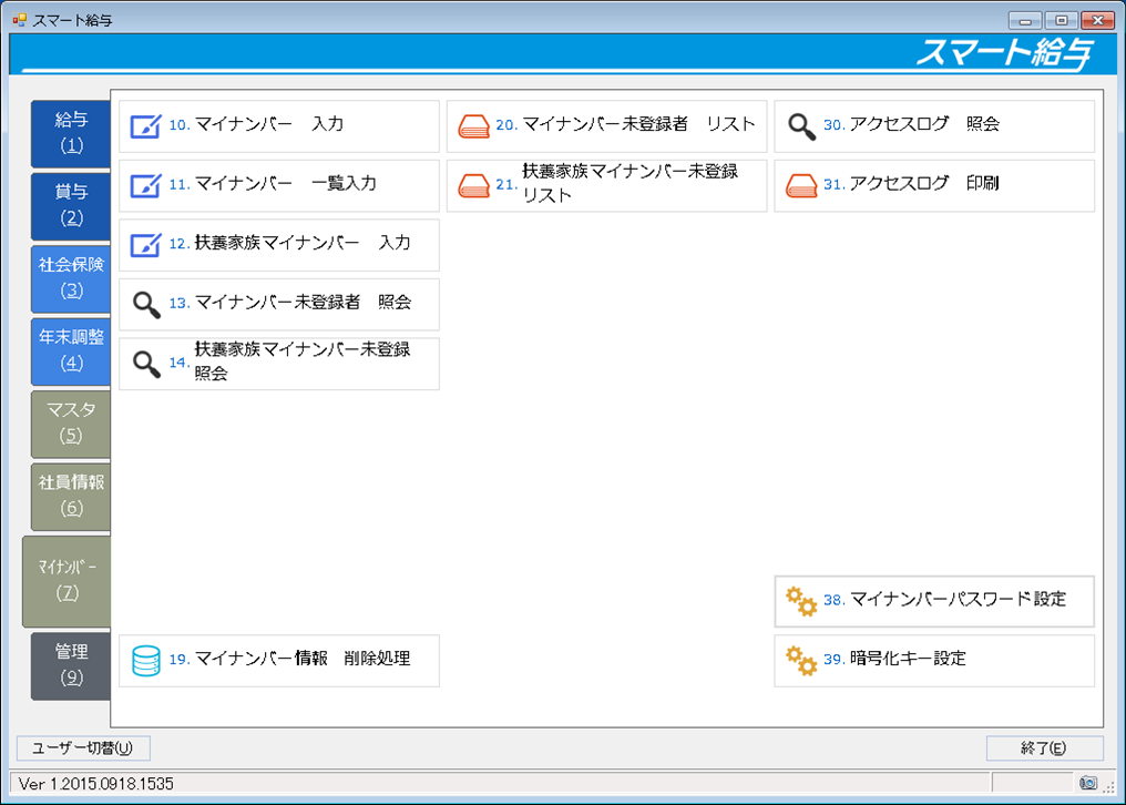 スマート給与ユーザーの中で更に、マイナンバー処理を行えるユーザーを登録しなければ専用メニューを利用することができません。