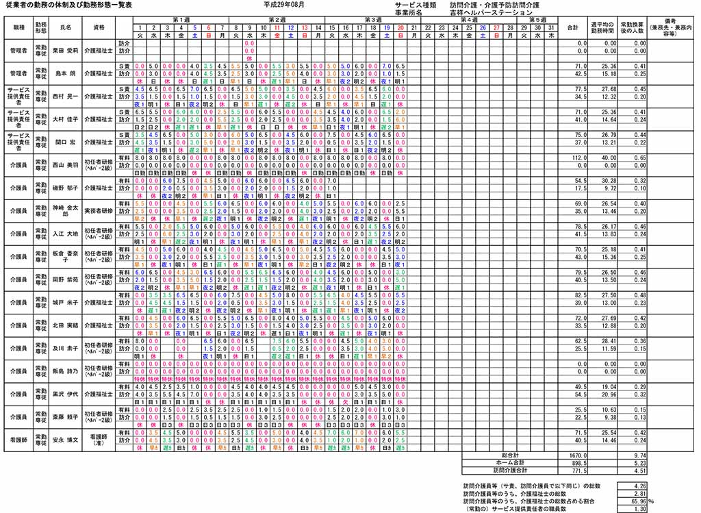 複雑なシフト内容においても勤務(サービス対応)実績を基に正確に常勤換算表を作成いたします。
