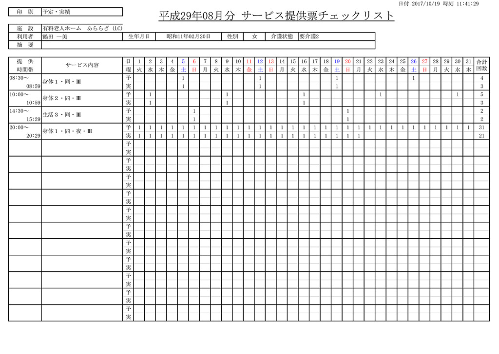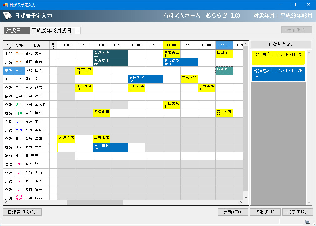 利用者のサービス提供内容と職員勤務表、さらには組合せを配慮し日課表を自動作成いたします。