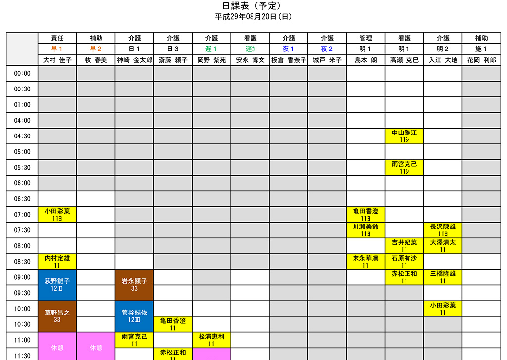サービス利用者の登録とそのタイムスケジュールが登録され、スタッフの勤務表から自動的に日課表を作成することができます。